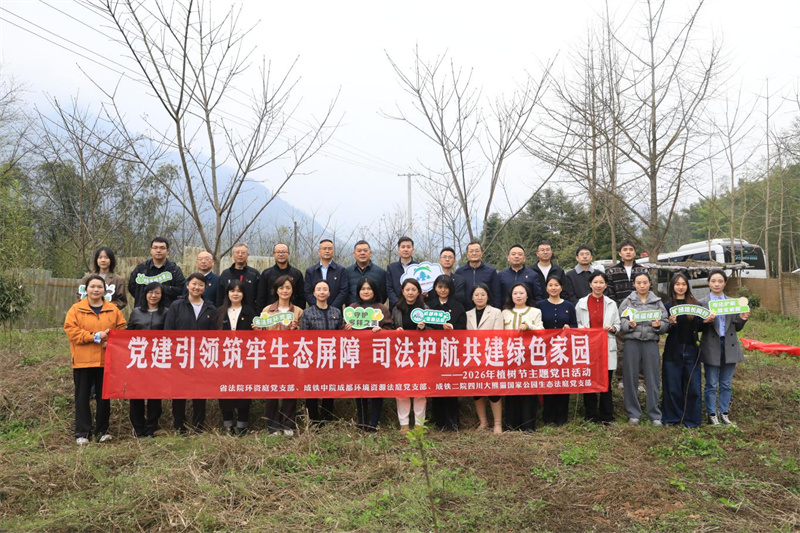 活动紧扣生态司法保护核心职责,将实践行动、普法宣传与理论研讨有机结合,让党建红引领生态绿,让法治力量融入生态保护实践。在鹤鸣镇两河口社区植树点,三级法院党员干警与当地社区党员干部、群众代表携手并肩,挥锹铲土、扶苗定根、围堰浇水,分工协作种下一棵棵树苗,共同打造“四川大熊猫国家公园司法保护林”。