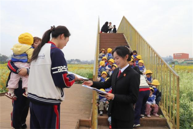 法院干警们像踏青的邻里友人,漫步在田垄之上,与周边摆摊的商户、踏青游玩的游客,开启了一场关于“法”的聊天。