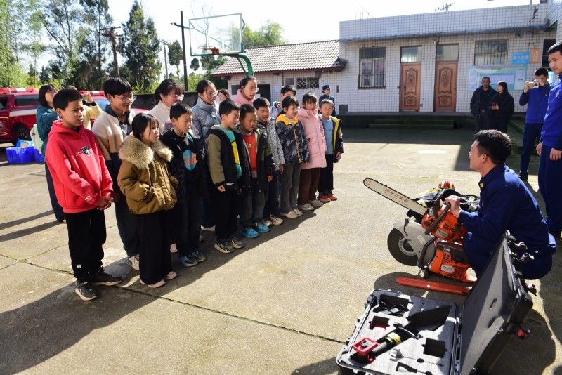 消防员向孩子们展示消防器材、救援装备。(资阳消防供图)