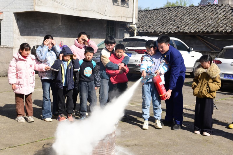消防员组织孩子们学习使用灭火器。(资阳消防供图)