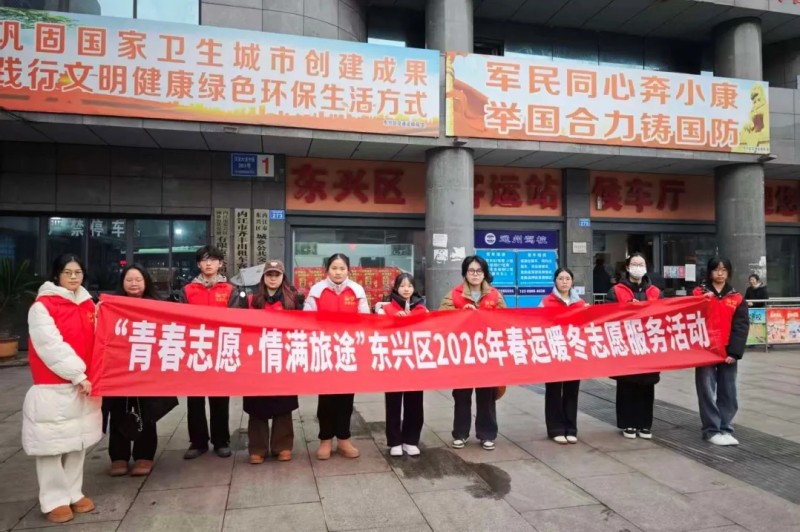 共青团东兴区委联合区委社工部在东兴区汽车客运站开展2026年东兴区“青春志愿 爱在旅途”春运暖程志愿服务活动,活动共组织30名返乡大学生、青年志愿者参与,为来往旅客提供咨询指引、行李搬运、秩序维护,对老、弱、病、残、孕等特殊旅客提供一对一暖心服务等。志愿者们用耐心、贴心、暖心的服务为旅途增添温暖,获得旅客的好评。
