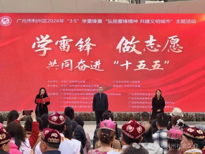 利州区以“学雷锋 做志愿 共同奋进‘十五五’”为主题,举办“弘扬雷锋精神・共建文明城市”志愿服务活动,现场宣读志愿服务倡议书并为3支新组建志愿服务队授旗。活动设置四大服务区域,通过图文展板展示社工风采与专业项目,志愿大集市提供义诊义剪、反诈宣传等便民服务,以“微心愿”墙打造“点单—认领”服务模式,还开设志愿者招募打卡区引导群众参与奉献。