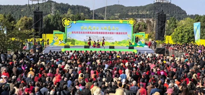 3月11日至12日,“百姓大舞台 志愿乡村行”南充市文化走亲惠民演出暨南部县西水镇第六届油菜花季,在香柱山村天府菜油基地圆满举行,以“赏西水菜花、览升钟湖景、观非遗表演、品特色美食”为核心,吸引周边近万名游客共赴春日之约。