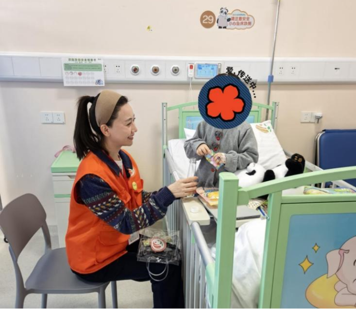 随后,冯家妹跟随该院医务社工走进儿科病房,开展儿童关爱探访活动。她为孩子们送上熊猫玩偶、解压捏捏乐、向日葵种子等暖心礼物,轻声与孩子们畅谈学校趣事,耐心倾听患儿家长的就医感受与实际需求,用温柔与善意传递公益力量。