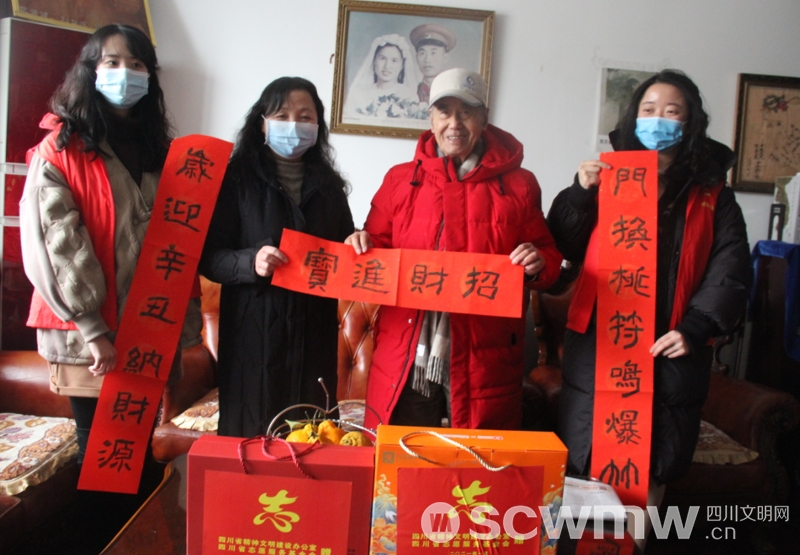 2月4日,省志愿服务小分队先后来到四川省新四军研究分会、金牛区和谐家园和郫都区“听涛园老兵俱乐部”看望新四军老战士潘孝臣,抗美援朝老兵、2020年度“四川省百名优秀志愿者”莫若健以及第四届四川省道德模范、2020年度“四川省十大最美志愿者”董贵生,为他们送上新春慰问品并致以新春的问候和诚挚的祝福。