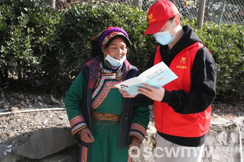 志愿者为阿坝州理县甲米村村民胡友花讲解新冠肺炎疫情防控知识。