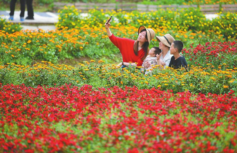 “赏花经济”催热各地乡村旅游,5月3日,游客在岳池县大石乡银城花海景区拍照。