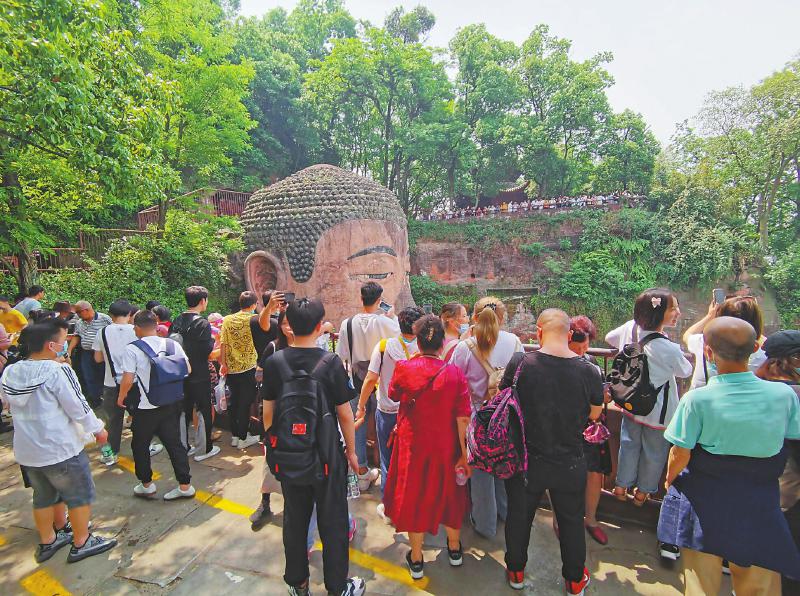 “五一”假期,乐山大佛景区为做好节假日期间疫情防控工作,确保游客体验感,实行分时游览,凌云山片区每日限量2.8万人,分4个时间段放行游客入园。