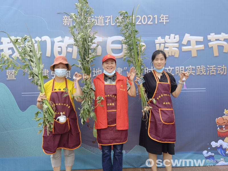 艾草招百福。为传承端午节优良传统文化,活动现场还设置了艾草赠送区域,居民群众排起长队领取艾草。图为:村民领取到艾草和香包。