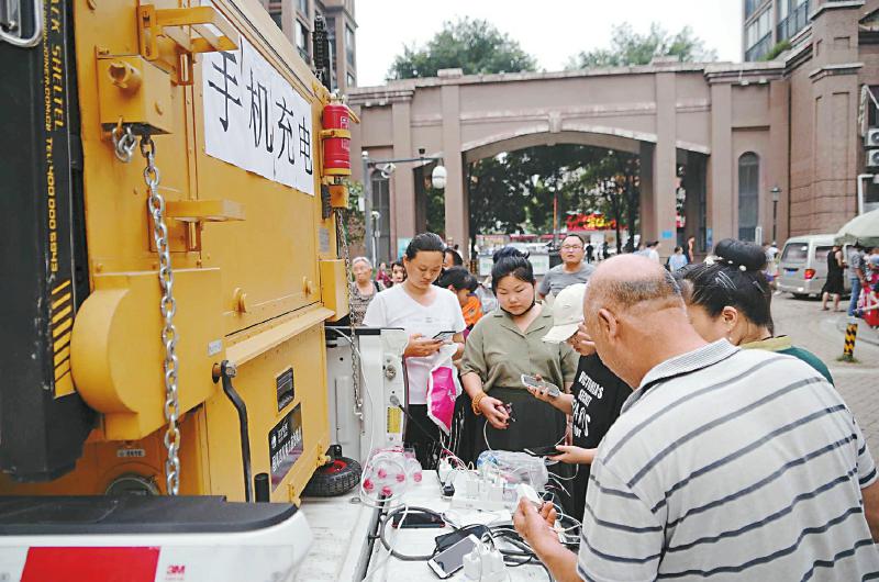 7月23日中午,国网四川电力抢险“先锋队”携带的充电方舱抵达郑州橡树玫瑰城小区,该设备可一次满足300台手机同时充电。