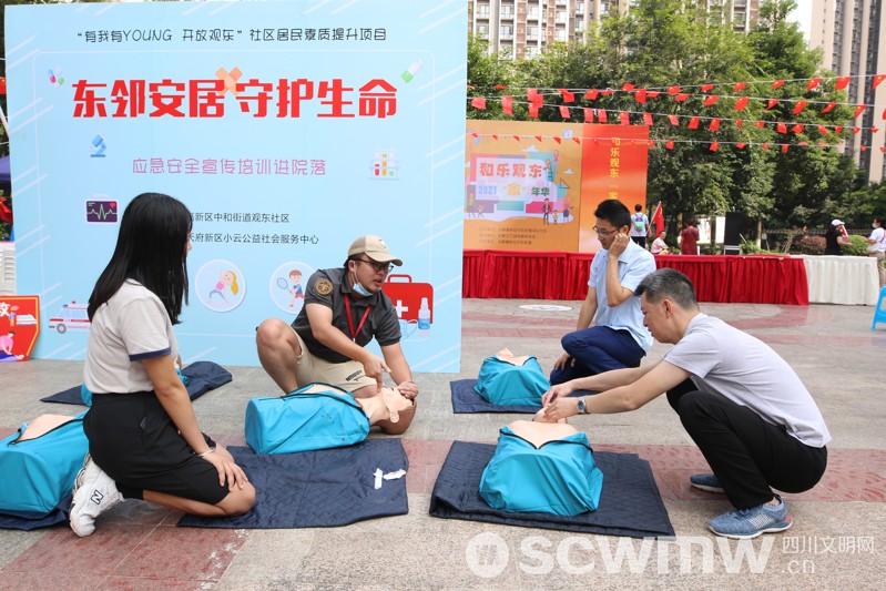 志愿者向居民普及心肺复苏术及安全应急急救技能。