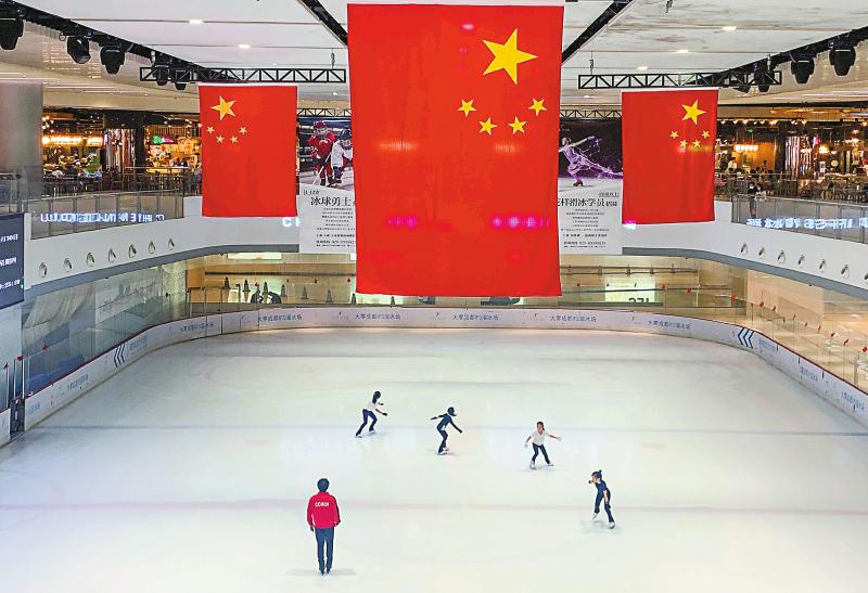 10月2日,滑冰爱好者在成都市的室内真冰场内练习。