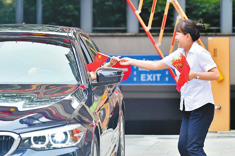10月1日,绵阳经开区涪滨路三江澜亭小区的物业人员向业主及过路行人送上小国旗,共同祝福祖国母亲生日快乐。