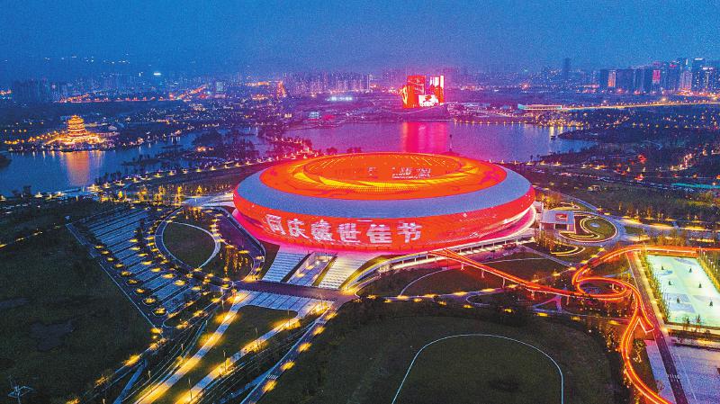 10月1日,成都市东安湖大运会主场馆亮起“中国红”,祝福祖国生日快乐。