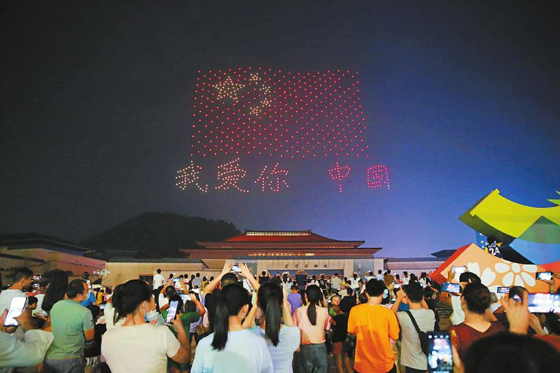 10月3日晚,600架无人机在宜宾市博物院新馆广场上空编队飞行,组合出“我爱你 中国”祝福图案。
