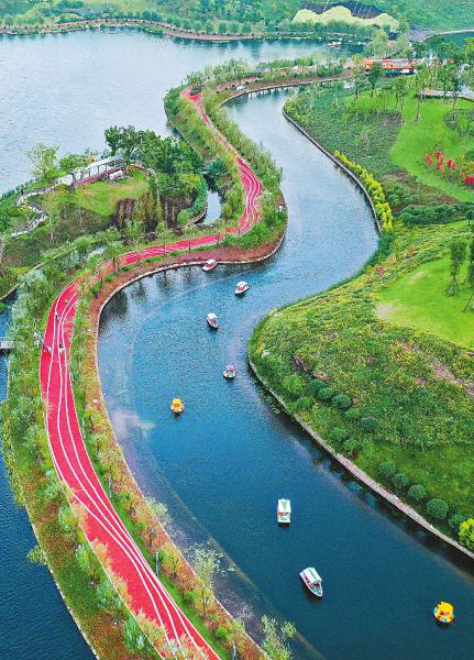 10月4日,泸州市渔子溪生态湿地公园内泛舟点点,该湿地经过3年的防洪整治和水生态修复后已成为当地的一个新景点。