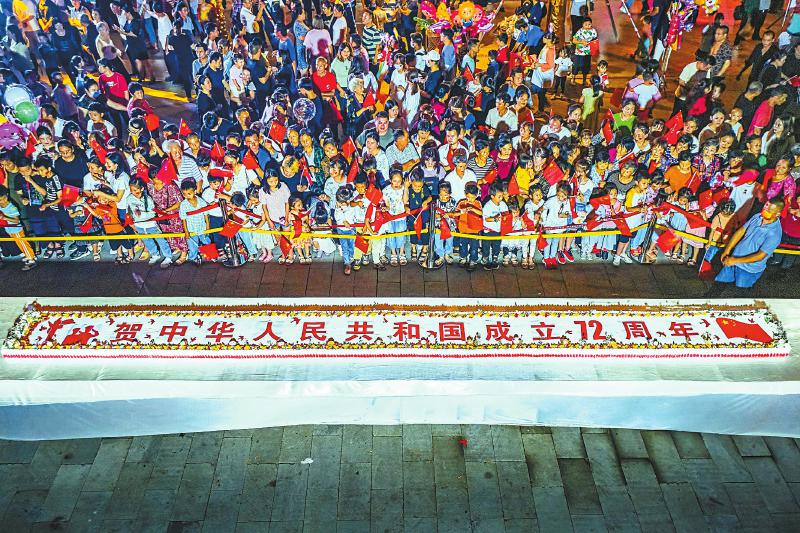 10月1日晚,巴中市恩阳区市民齐聚米仓老味道特色街区,举行“我为祖国过生日 巨型蛋糕迎国庆”的公益庆祝活动。