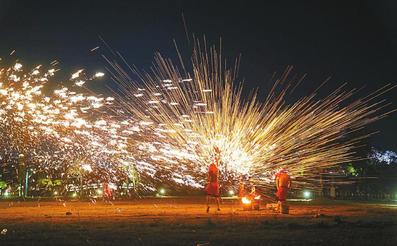10月1日晚,民间艺人们在遂宁市圣莲岛景区打起了炫丽的铁花,为祖国送上祝福。