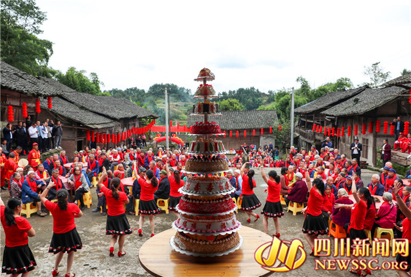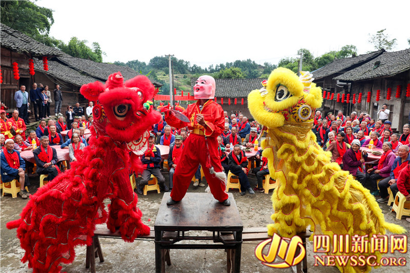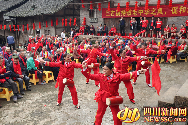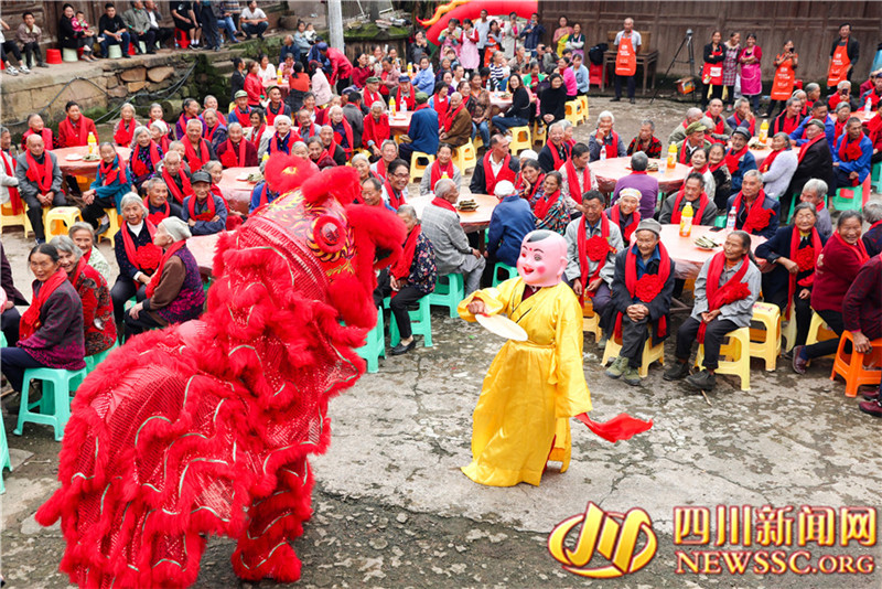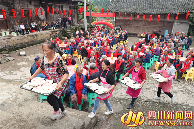 又是一年重阳时,四川省广安市邻水县三古镇双丰、白水等村, 联合在古院落游家大院开展“尊老敬老,欢度重阳”主题活动,通过为360多名70岁以上的老人舞敬老狮、献敬老舞、蒸敬老糕、喝敬老茶、摆敬老宴等传统文化活动,弘扬中华民族尊老敬老的传统美德, 让老人们在开心中度过自己的节日。(邱海鹰 张天文 记者 游伍琼 摄影报道)