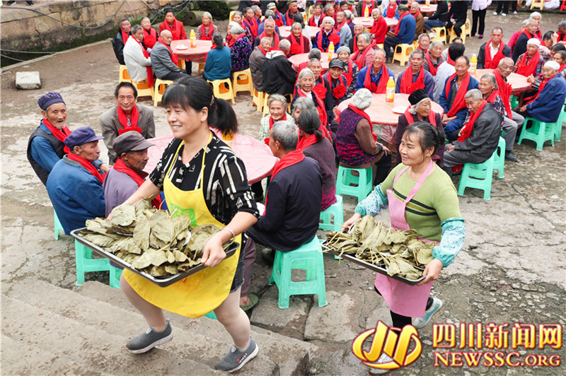 10月12日,在四川省广安市邻水县三古镇古院落游家大院,服务人员在为老人们运送桐子叶制作的寿粑,欢度重阳节。