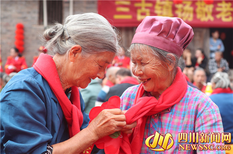 10月12日,四川省广安市邻水县三古镇在古院落游家大院开展的“尊老敬老,欢度重阳”主题活动中,两位老人在相互佩戴红围巾,欢度重阳节。