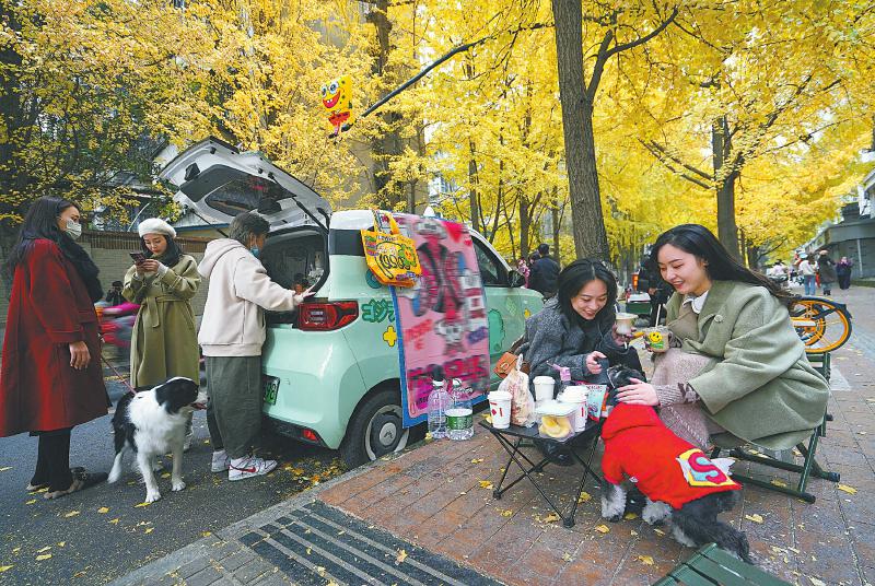 11月25日,雷鑫(左三)开着他的咖啡车在成都银杏路冲调咖啡。