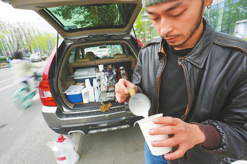 3月25日,咖啡车从业者刘博文在成都大悦城外面的街道上调制咖啡。