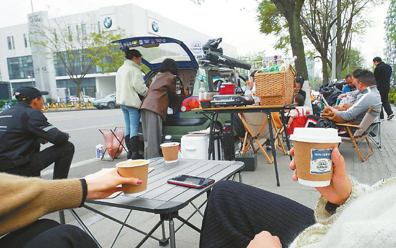 3月25日,咖啡爱好者在成都太平园东二街品味“咔博可咖啡车”冲调出的咖啡。