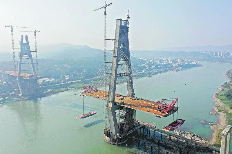 宜宾临港公铁两用长江大桥是新建川南城际铁路自贡至宜宾线的重点控制性工程,是国家“八纵八横”网中渝昆高铁、蓉昆高铁过长江的共同通道,同时也担负着宜宾市北岸翠屏区、南岸叙州区的市政交通过江功能。大桥将于2023年建成通车,建成后它将创造一个“国内之首”、两个“世界之最”:国内首座高铁与公路平层布置的斜拉桥、世界最大宽度的公铁两用斜拉桥、世界跨度最大的公铁两用钢箱梁斜拉桥。