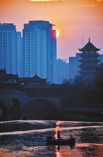 同一天,在200多公里外的成都,锦江巡河员正迎着日出进行河道巡护。元旦节前,成都环城生态公园环线100公里长的一级绿道全线贯通,环城生态公园121个特色园逐步串珠成链。市民沿着一级绿道就可一路环游环城生态公园,真切感受到高品质生活宜居地带来的人与自然和谐共生。