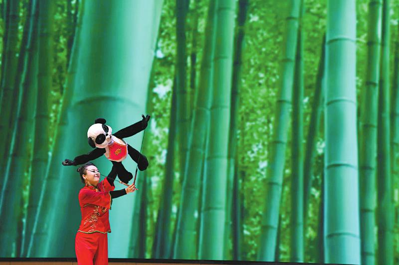在“大熊猫老家”雅安市宝兴县,成都市非遗保护中心演员韩馨莉带来的木偶表演《熊猫咪咪》,一出场就吸引了大家的目光。节目中,韩馨莉操控着手中的大熊猫木偶灵活地做出各种动作,展示了高超技艺。大熊猫木偶还在她的指挥下用毛笔作画,让观众啧啧称奇。