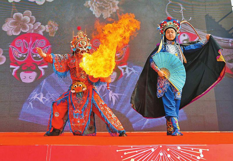 1月31日,川剧绝活《变脸吐火》在宜宾市屏山县马湖公园上演。