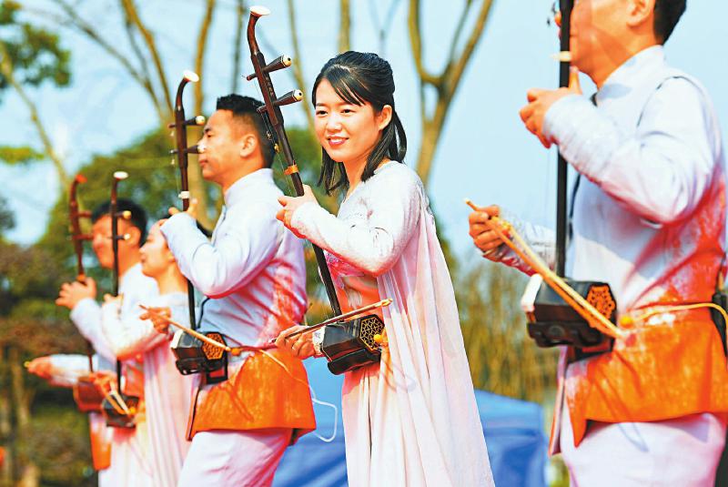 2月9日,二胡齐奏《风舞绿洲》在雅安市名山区茶史博物馆外广场上演。