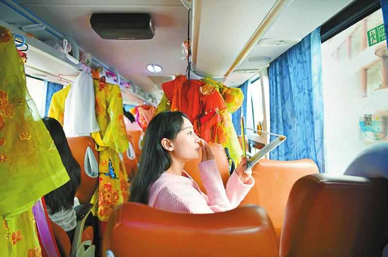 2月9日,四川省歌舞剧院的舞蹈演员孙玉玲在赶路的大巴车上化妆,为演出做准备。
