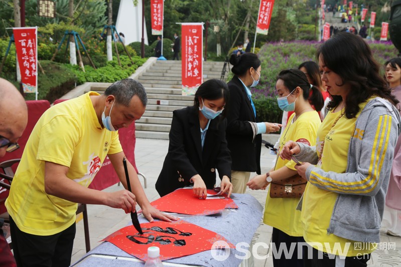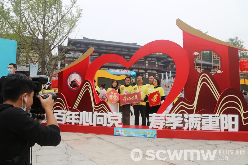 四川文明网眉山讯(周洁)10月14日,农历九月初九,重阳节。早上8点多,“中国长寿之乡”眉山市彭山区的彭祖山景区西广场上已是人头攒动,不少市民在“百年心向党 寿孝满重阳”的活动主题墙前排队打卡,拍摄着全家福,用影像记录美好亲情,用照片定格幸福瞬间,等待着四川省2021年“我们的节日·重阳”示范活动的启动。