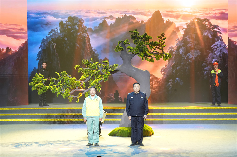 活动现场,情景小品《一动一静,守护黄山之巅》生动讲述安徽黄山风景区普通工人李培生、胡晓春用心用情守护美丽黄山的故事。多年来,李培生“以山为家,以路为友,宁脏一人,不污一处”,每天穿梭于悬崖峭壁间,守护黄山的绿水青山。胡晓春每年驻守黄山300多天,克服孤独寂寞和极端恶劣天气,守护迎客松的苍翠挺拔。在现场回答学生提问时,胡晓春说道:“迎客松不单单是中国的品牌,也是中国对外的一个友好象征,是中国礼仪文化的一个代表。我们要把它守护好,让它以优美的姿态展现给更多的人。迎客天下,广迎四海宾朋!”这话落下,舞台上的迎客松模型似乎也在轻轻颔首。