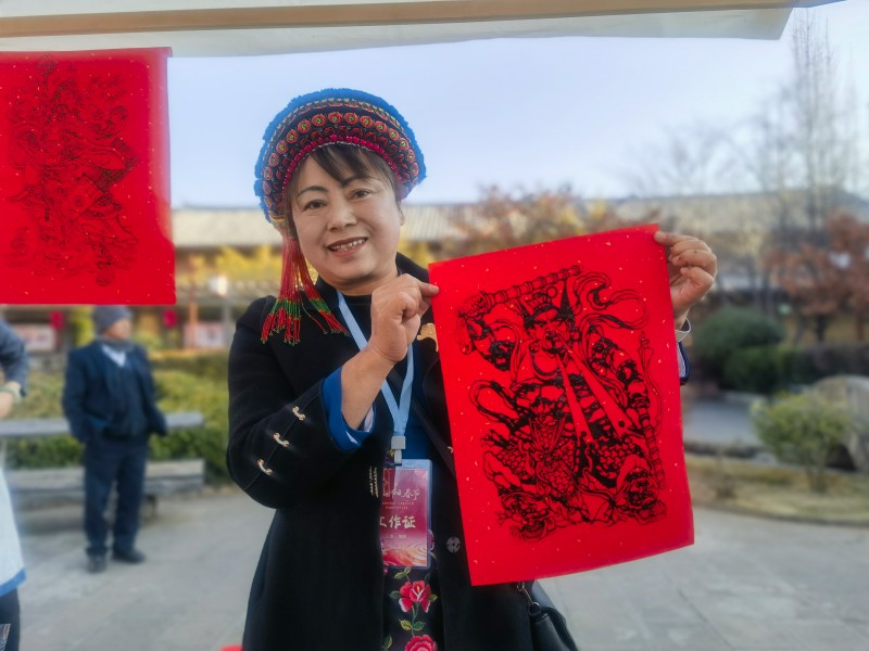 观众席旁还设立了具有剑川文化特色的木雕、布扎、刺绣、甲马、黑陶等非遗集市,在木雕师傅的刻刀下,一个个木雕栩栩如生;布扎艺人手中的彩线翻飞,转眼间,一只憨态可掬的生肖小兽便活灵活现;非物质文化遗产代表性传承人现场展示甲马制作技艺,吸引众多群众参与体验,近距离感受非遗魅力。