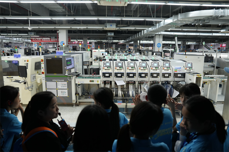 “机器的哪个部位是放杯子的?装咖啡豆的豆仓在哪里?当我们点了一杯咖啡,机器内部又是如何工作的?”……上午10点,在长虹双创科技工业研学基地,大家深入了解了智能咖啡机的运作流程,观摩从咖啡豆的研磨到咖啡液的萃取的全过程,直观感受工业设计中细节的重要性。在长虹精密电子制造厂电子元件组装区,少年们隔着玻璃看到贴片机以惊人的速度将微小元件精准贴附到电路板上,发出阵阵惊叹,深刻体会到科技带来的生产效率飞跃。