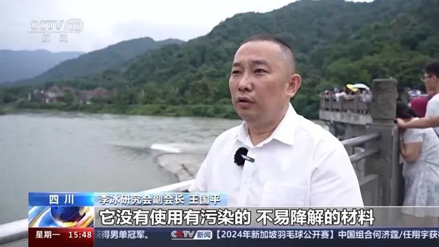 李冰研究会副会长王国平:它没有使用有污染的、不易降解的材料,而是就地取材,就用我们随处可见的石头、泥土、木头、竹子,这样低碳环保的材料完成了对都江堰水利工程的建设。