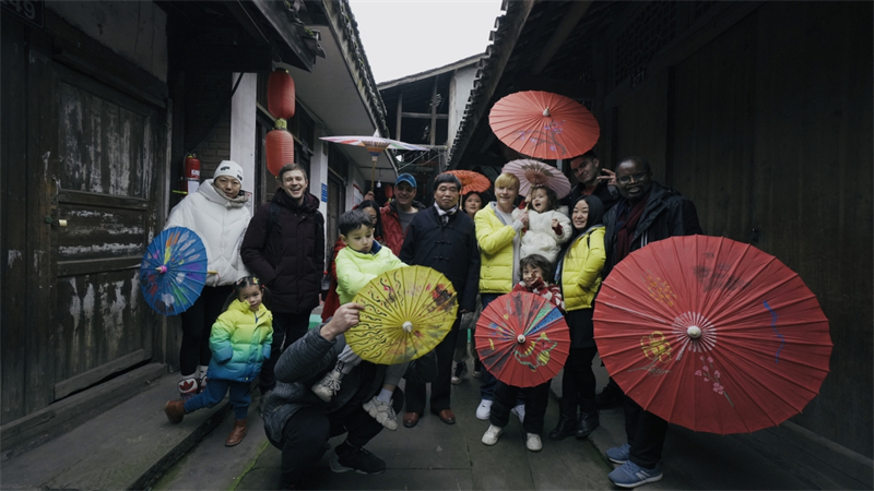 紧邻博物馆的是分水岭镇老街。“家家都有制伞匠,户户都会编伞线。”描写的就是分水岭镇制作油纸伞的盛况。临近新年,油纸伞作坊内一片繁忙,朵朵伞花竞相绽放。在这里外籍友人们不仅了解到了油纸伞的悠久历史,还亲自绘制了一把属于自己的油纸伞。来自乌克兰的谢尔盖很兴奋:“太有意思了,特别是知道油纸伞悠久的历史后。很高兴能够和家人朋友们一起到泸州体验这种古老又有趣的手艺。”马里医学博士迪亚拉当场购买了心仪的油纸伞和团扇留作纪念。