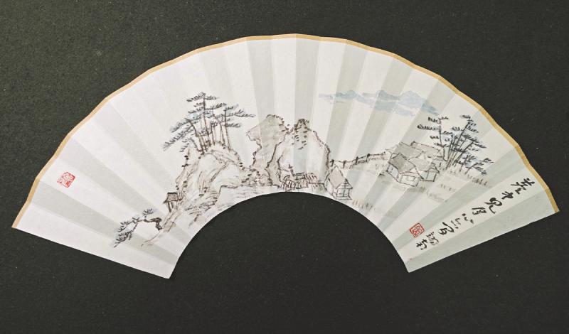 世运村文化互动体验区陈列的扇面山水画。岳翊南供图