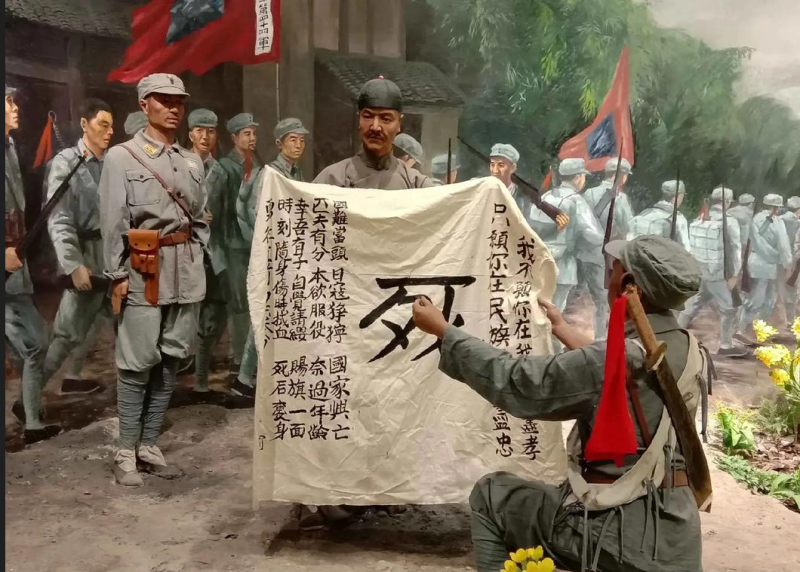 午后,建川博物馆内的川军抗战馆静默如碑,安静得只剩雨声。馆内一角,川军王建堂伫立队首,接过了其父亲王者成用白布书写的“死”字旗。“我不愿你在我近前尽孝,只愿你在民族分上尽忠……”“死”字旗右侧的文字苍劲有力。这承载誓言的布帛,浓缩着川人“宁碎头颅,不丢寸土”的血性。