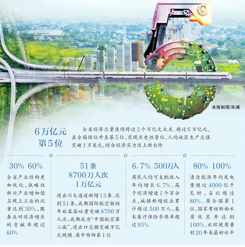 从成渝地区双城经济圈建设看,川渝携手共建的4个特色产业集群均达到万亿规模,成渝综合性科学中心、西部金融中心、巴蜀文化旅游走廊建设等结出累累硕果,成渝中线高铁、成达万高铁等标志性工程加快建设,两省市正加快打造高质量发展的重要增长极和新的动力源。从扛牢经济大省挑大梁政治责任看,省重点项目累计完成投资超过4万亿元,成都成为全国第2个消费突破万亿元的省会城市,六大优势产业加快提质倍增,数字经济核心产业增加值突破5000亿元,四川加快从经济大省向经济强省跨越。