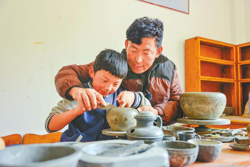 德格县麦宿镇手工艺人在教儿子制作土陶。洛绒尼玛 摄