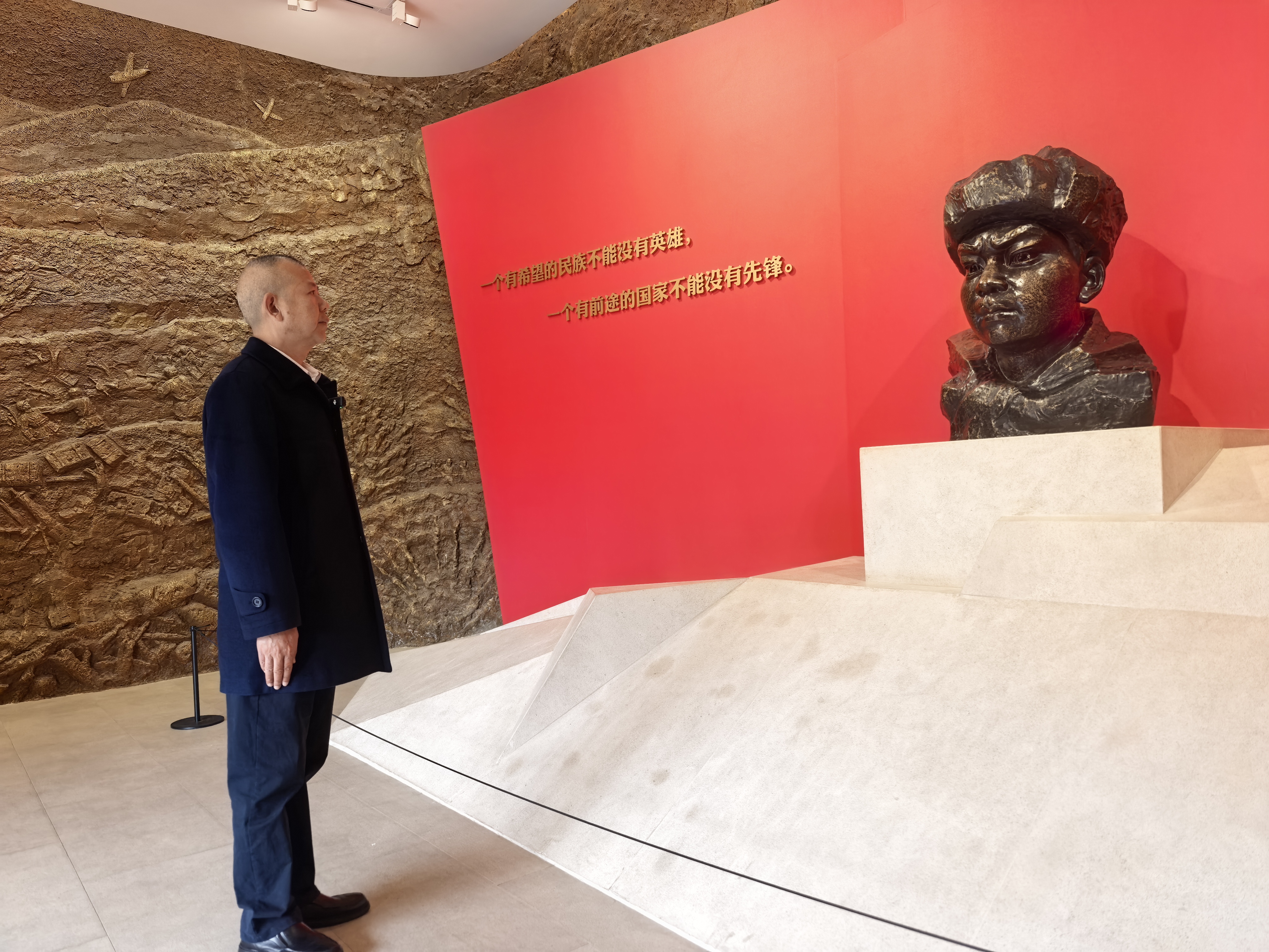 黄拥军在黄继光烈士雕像前。罗园 摄