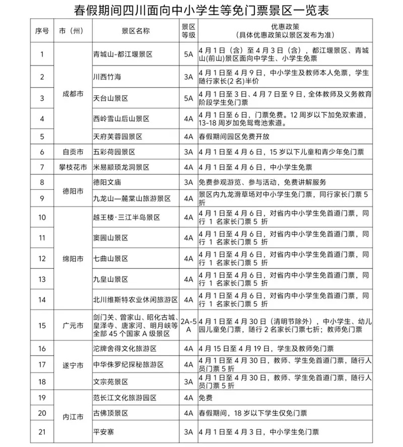 其中,广元全市45家A级景区于4月1日至4月30日(清明节假期除外)面向全国全日制中小学生、幼儿园儿童、在职教师免门票,每名学生(儿童)随行的2名家长(或法定监护人)也可享受门票7折优惠;青城山-都江堰、海螺沟冰川森林公园等景区针对中小学生等特定群体实施免门票政策;瓦屋山景区、安岳石刻·圆觉洞、天府芙蓉园、黑水县卡龙沟等景区面向所有游客免门票。除100多家景区免门票以外,达古冰川、丹景台等部分景区也推出不同的门票优惠政策。