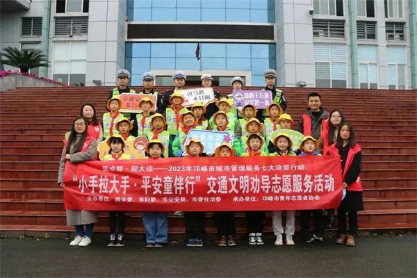 为倡导文明交通新风尚,提高安全意识,引导广大青少年积极融入参与到“爱成都·迎大运”城市环境品质提升活动中,邛崃公安联合多部门组织开展“小手拉大手”青少年交通文明劝导系列活动。