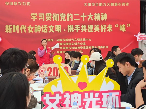 活动中,邛崃市新时代文明实践中心志愿者杨树文以讲座和有奖问答的形式组织学习宣传贯彻党的二十大精神,鼓励新时代女性爱岗敬业,奋勇争先,为建设文明城市贡献力量。