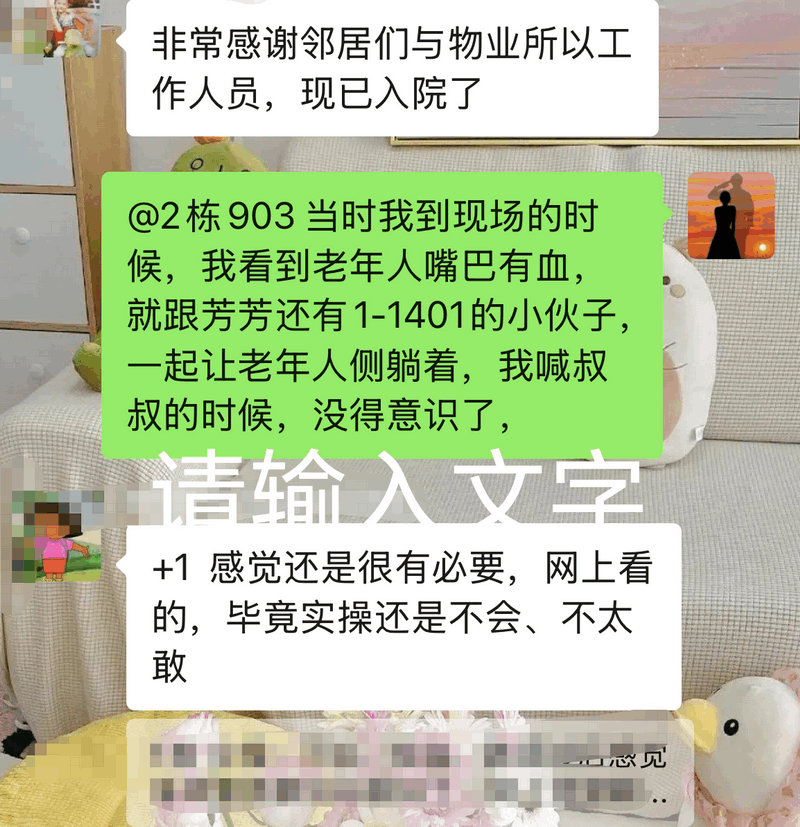 正在家中调休的社区民政协理员赵长芸看到消息后,毫不犹豫地冲出家门,迅速赶往现场。途中,她在业主群内冷静指挥,提醒现场居民和物业人员立即拨打120急救电话,并准确描述事发地点。与此同时,群内其他参加过急救培训的居民和骨干业主也纷纷发声,提供正确的施救指导。一场与时间赛跑的生命救援行动就此展开。