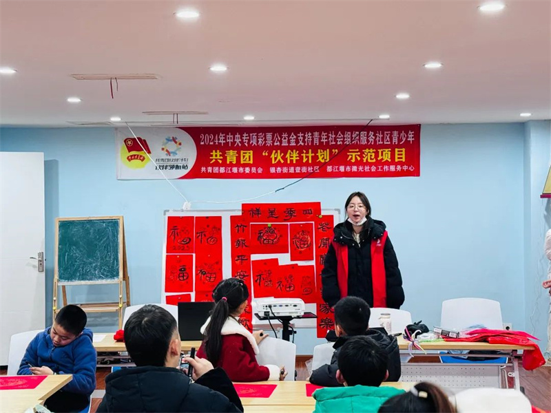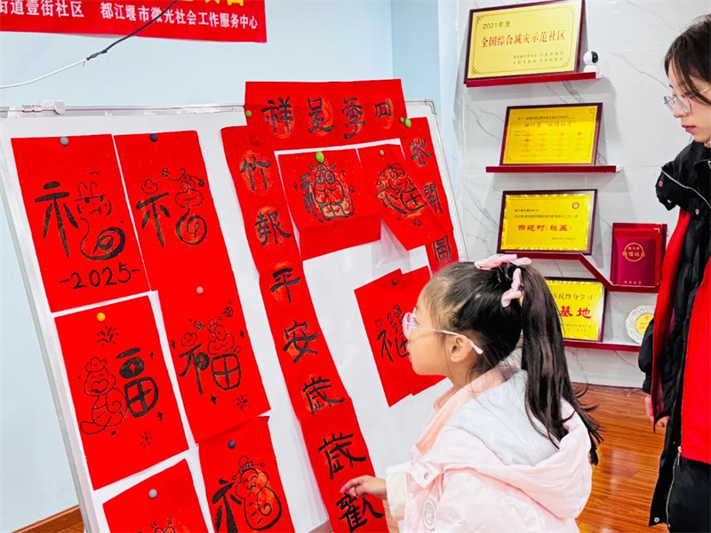 为了让辖区青少年度过一个欢乐且富有意义的节日,感受中国传统文化魅力,激发艺术创造力,1月24日,都江堰市银杏街道壹街社区携手微光社工组织开展了“画蛇添‘福’・喜迎新春”主题活动,带领青少年们用笔墨书写新春祝福。